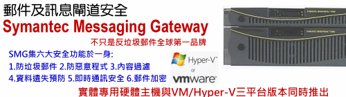 Symantec 同時提供能與Exchange Server 嚴密整合的反垃圾郵件方案-Premium Anti-Spam,它採用與SMG完全一樣的反垃圾郵件過濾技術與後端運籌平台,已內建於郵件主機防護的-SMS(Symantec Mail security) for Exchange 上,只需購買啟動授權,就能馬上在原有的郵件主機發揮到99%的攔截率,百萬分之一以下的誤攔率的效益。更重要的是,它不需要更改您的網路架構及相關設定。 |