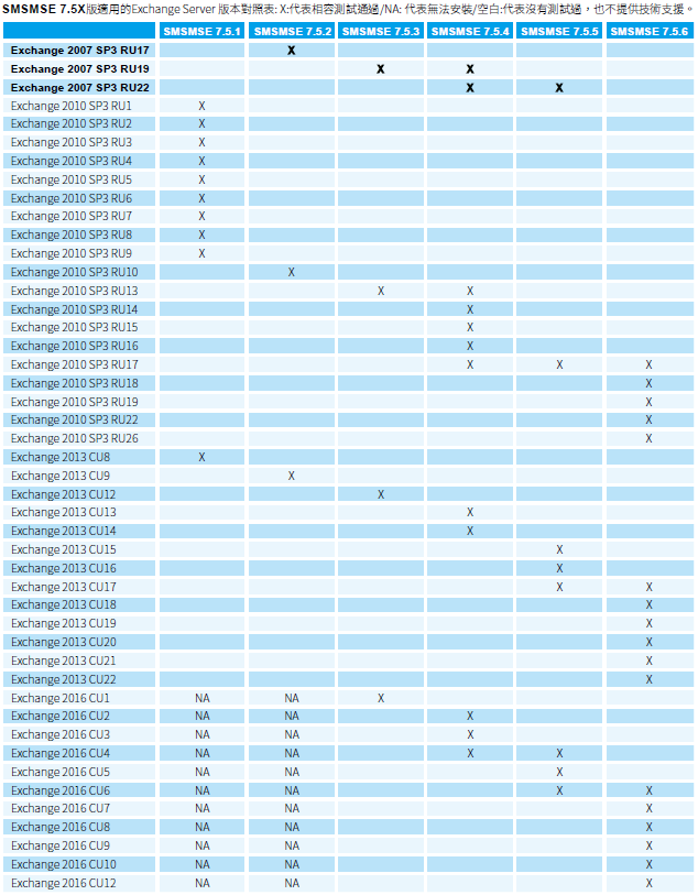 X:代表相容測試通過, NA: 代表無法安裝, 空白:代表沒有測試過,也不提供技術支援。 |