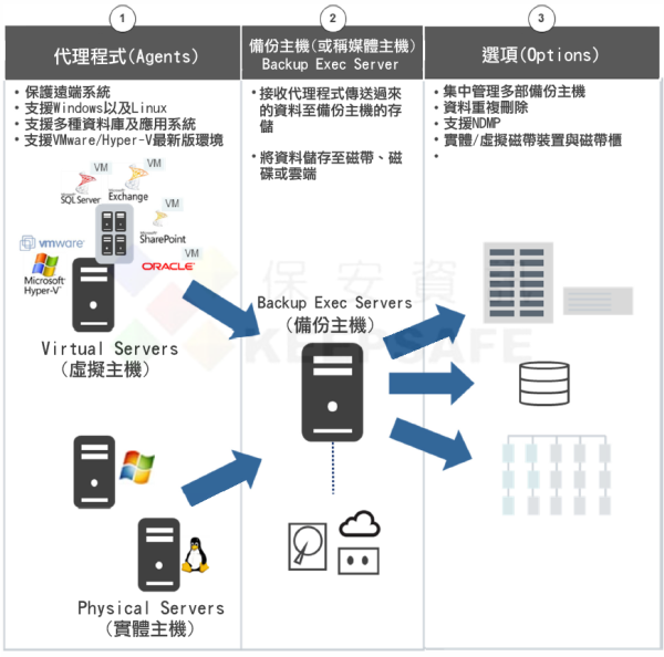 BE 架構:有三大元件-備份/核心主程式(Core)、代理程式(Agent)以及選項(Option)。而購買的授權與計價方式,其實也就是這三大元件的組合。Backup Exec 16 是易於取得、授權及部署的高成本效益解決方案。彈性的內部部署軟體授權選項包括除(1)標準典型的分項計價:按模組、媒體伺服器、代理程式或選項以外,還提供(2)虛擬平台吃到飽的方案:V-Ray Edition,是以處理器插槽數量(CPU數量)計價以及(3)以備份來源端的容量,按 TB 數量計價三種。