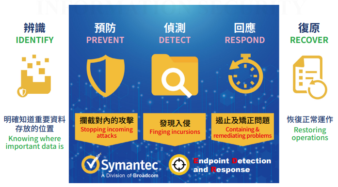 特別是美國國家標準技術局(NIST)於2014所發布的網路安全框架(Cybersecurity Framework)的5大核心:識別(Identify):明確知道重要資訊資產放在哪裡、保護(Protect):攔截對內的攻擊、偵測(Detect):發現入侵、回應(Respond):遏止及矯正問題與復原(Recover):恢復正常運作。定義了企業建構網路安全防護時,所需要重視的5大構面,讓企業在管理安全風險時,能夠對應到事前預防、事中處置與事後檢討改善的環節,提供網路安全生命週期的管理策略。NIST的網路安全框架更是EDR被列為企業資安必要解決方案的最大推手。