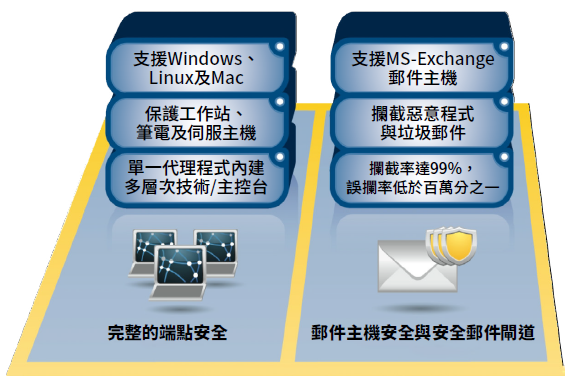 SPSEE是完整的資訊安全(Secure)與資訊保護(Safe)解決方案。它包含賽門鐵克在端點、伺服主機、郵件伺服主機、郵件閘道等多層級全方位的安全防護,並提供完善的全局安全管控能力。以最經濟的成本提供易於管理並能自動控制重要的IT資產的企業資訊安全完整解決方案,是企業降低投入成本與時間成本的最佳資訊安全解決方案。SPSEE可建立一個受保護的端點、訊息及網路環境,以抵禦當今複雜的惡意程式、資料外洩及垃圾郵件威脅。利用賽門鐵克領先市場的技術,使用單一登入網頁主控台及更有效地管理 IT 基礎架構無可避免的風險,降低保障您環境的成本。
